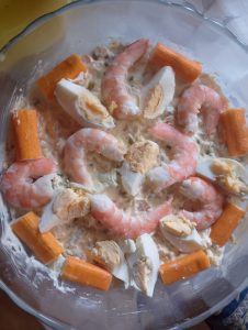- Ensaladilla de bonito, gambas, cangresjo y huevo