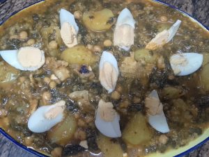 - Potaje con patata, garbanzos, espinacas,bacalao y huevo duro