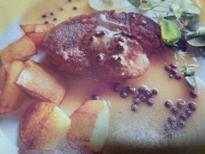 - Solomillo con crema de pimienta verde, nata y patatas