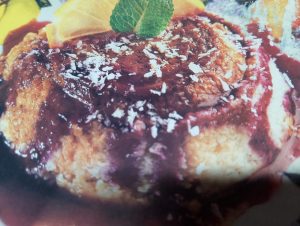 - Flan de coco con salsa roja y coco por encima y naranja
