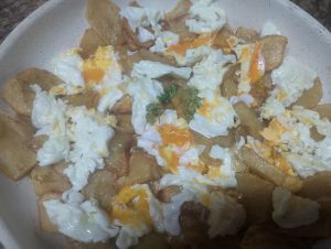- Huevos estrellados (con patata, ajo, perejil y vinagre)