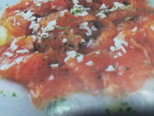 - Carpacho de salmón (naranja, limón, huevo picado con pimienta aceite y sal)