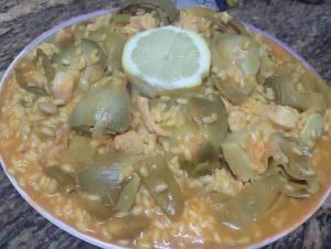 - Arroz caldoso con alcachofas, judias verdes, habas y pulpo.