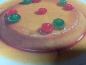 - Flan de yema de huevo y azucar, adornado con cerezas dulces
