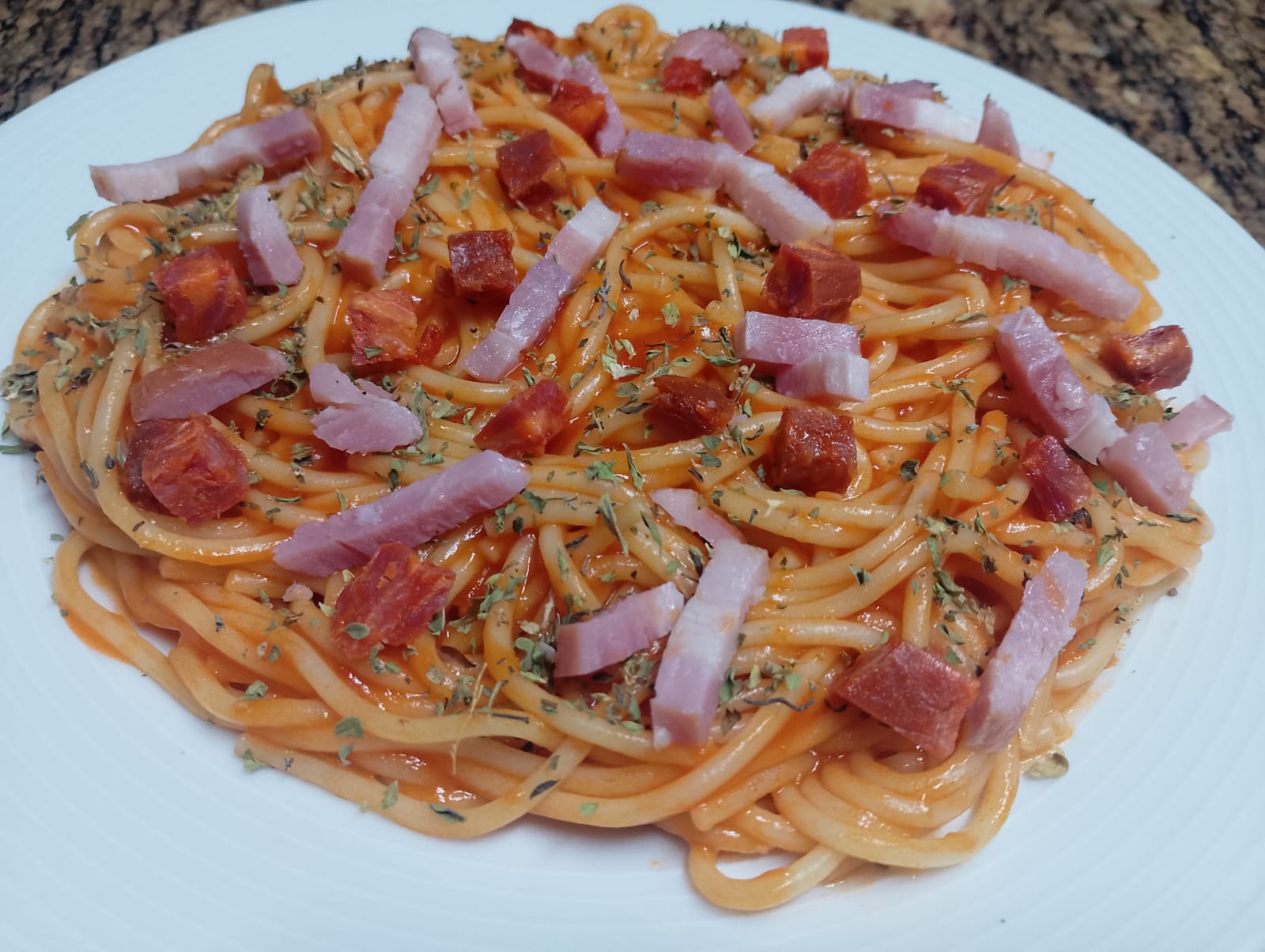 - Espaguetis con tomate, cebolla. mantqeuilla, orégano bacon y chorizo