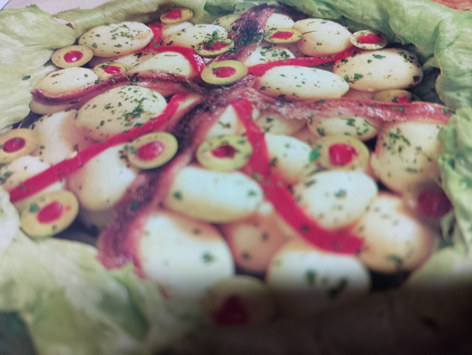 - Ensaladilla con patatas, anchoas, pimiento y aceitunas rellenas de pimiento