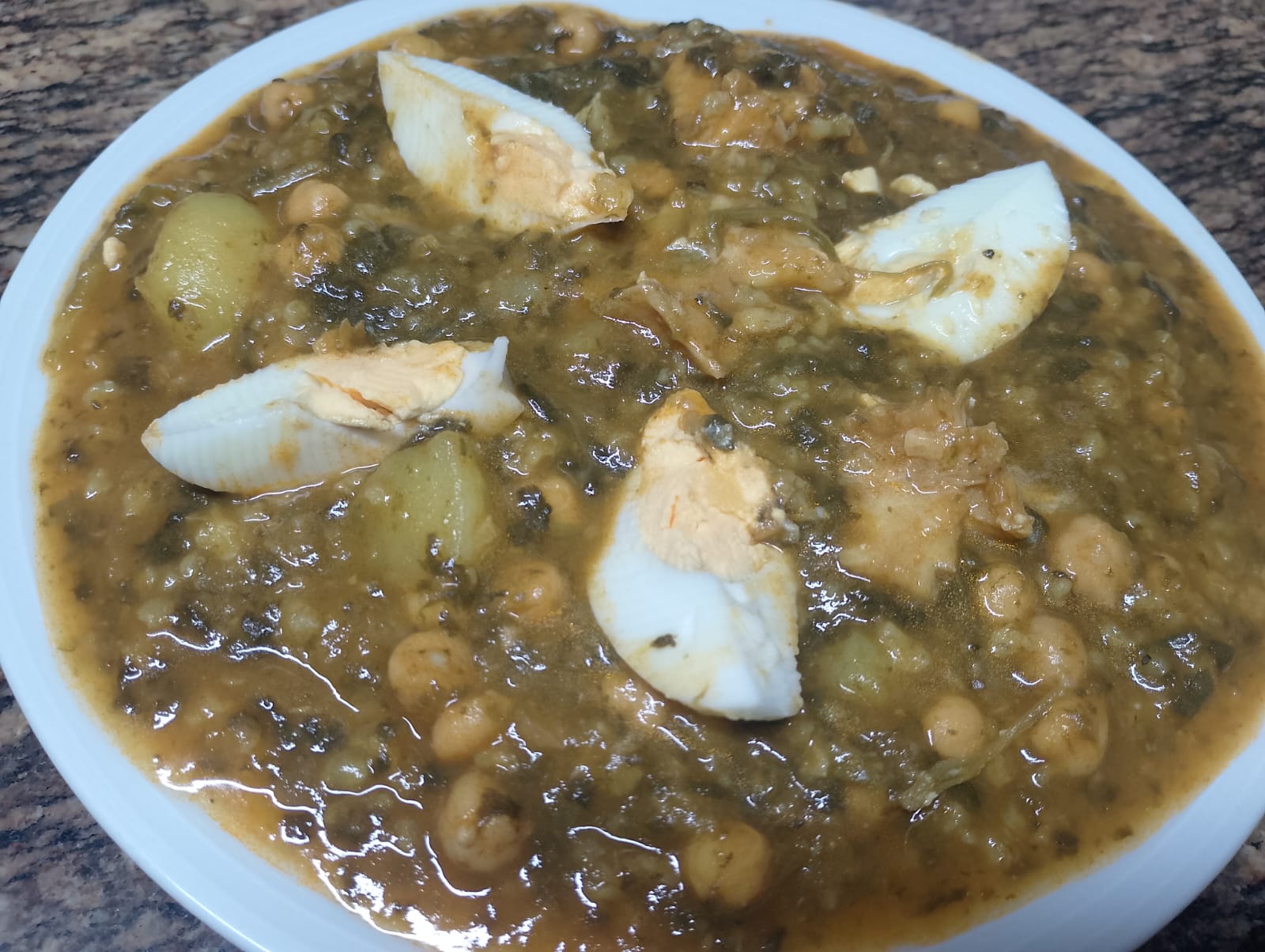 - Potaje con patata, garbanzos, espinacas,bacalao y huevo duro