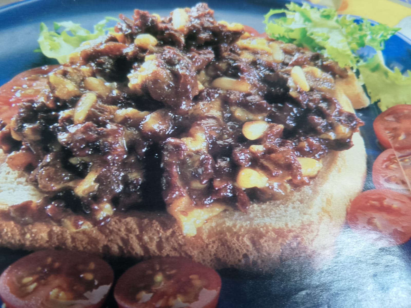 - Tosta de pan con morcilla y piñones