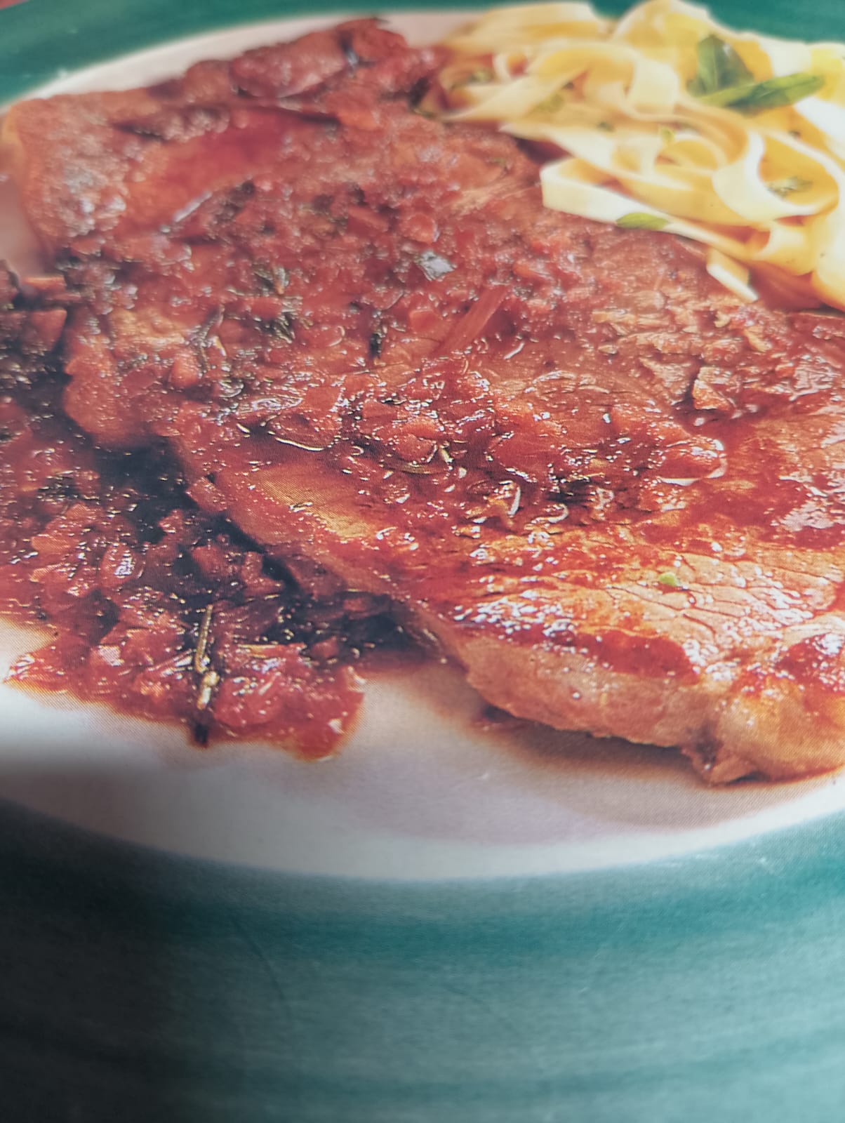 - Chuletón de ternera con pimienta, tomate y tallarines