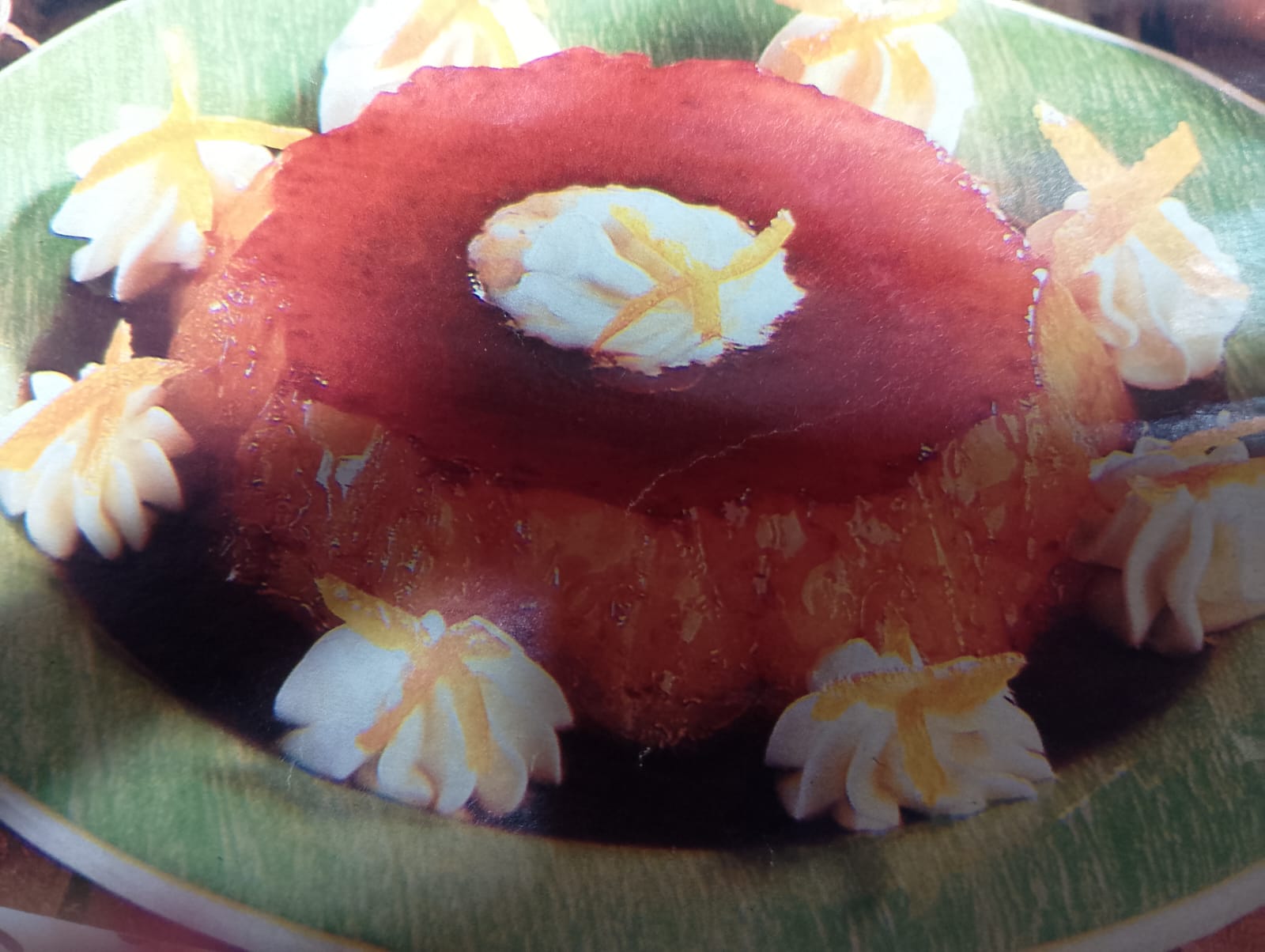 - Flan de yema de huevo y azucar, adornado con cerezas dulces