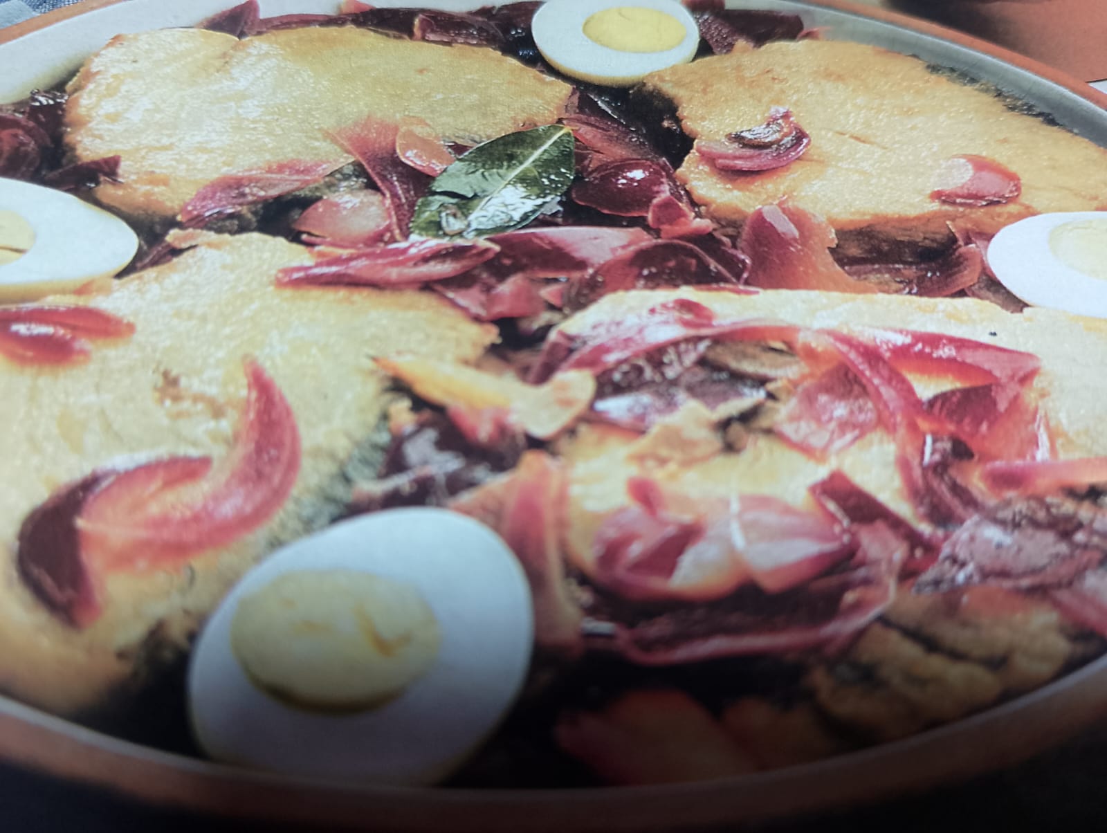 - Bonito con cebolla roja, laurel, ajos y un vaso de agua y vinagre. Se acompaña con un huevo duro.